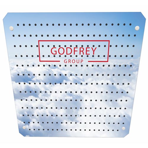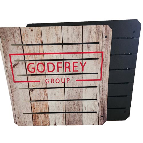 Full color photographic prints, logos, etc. can be added as panel overlays. The overlay can fit the slatwall side or the pegboard side. The panels can be solid as well (without cutouts for slats or pegs) if you want to do graphic in an area where you don’t need to hang fixtures and products (i.e. header graphics at the top of the back wall).