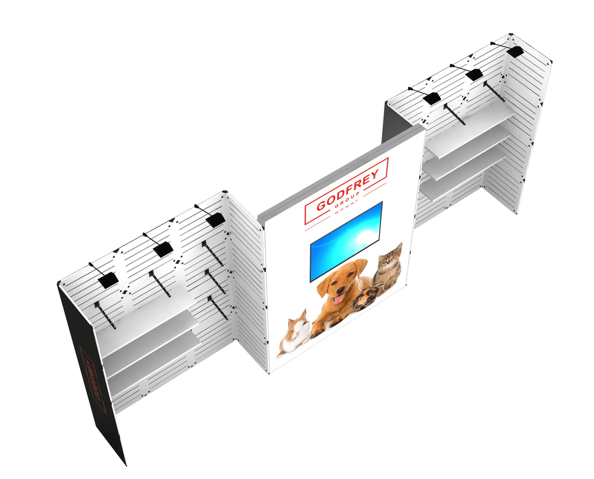 Display Material: Molded plastic slatwall panels, aluminum light boxes, LED light, fabric backlit graphics